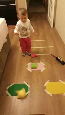 Bu etkinlik için ihtiyacımız olanlar oldukça basit. İlk olarak, renkli A4 keçelerini zemine dikkatlice bantladım. Her bir renk, farklı bir hedefin işaretini oluşturdu. Elisa'nın, her rengin karşılığı olan fasulye torbalarını doğru hedefe atmasını sağlamak istedim. Bu, ona hem renkleri tanıma fırsatı sundu, hem de atma becerilerini geliştirdi.